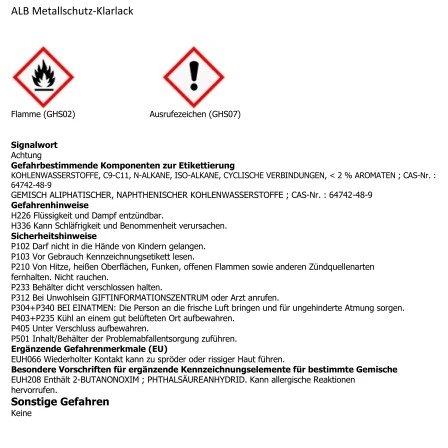 Glänzender, farbloser Lack für Nicht-Eisen-Metalle (blankes Aluminium, Zink, Messing, Kupfer, Zinn). Geeignet für Innen und Außen. Verhindert Anlaufen und Verfärbungen, vergilbungsbeständig, hitzebeständig bis +200 °C, schnell trocknend, hohe Wetter- und Wasserbeständigkeit.