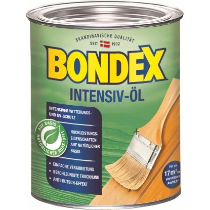 Bondex Intensiv-Öl bietet intensiven UV- und Witterungsschutz. Mit Hochleistungseigenschaften auf natürlicher Basis ist es einfach zu Verarbeiten, bietet eine beschleunigte Trocknung und einen Anti-Rutsch-Effekt. Offenporig und feuchtigkeitsregulierend, streich- und sprühbar. Einfache Verarbeitung mit Anti-Rutsch-Effekt.