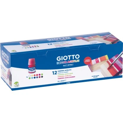 GIOTTO Dekor-Acrylfarben im 25 ml-Topf, mit Schraubverschluss. Feine Farben auf Wasserbasis, mit mattem Trockeneffekt. Deckend und leicht aufzutragen, sind sie ideal für die Dekoration jeder Oberfläche: Papier, Holz, Glas, Leder, Terrakotta, Keramik, Kunststoff, Stein, DAS, Metall, usw. Die Farben sind langlebig und bieten eine gute Lichtbeständigkeit. Sie sind unbedenklich, sicher und gut vermischbar. Außerdem haben sie einen neutralen Geruch und können von der Haut mit der Bürste mit warmem Wasser und Seife abgewaschen werden.