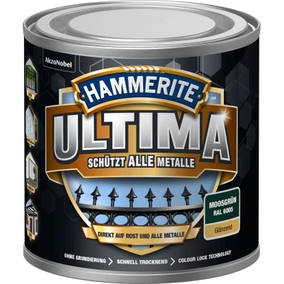 Der Hammerite Ultima Premium Metall-Schutzlack glänzend 250 ml Moosgrün RAL6005 schützt alle Metalle und kann direkt auf Rost aufgetragen werden. Der ultimative Schutzlack ist Grundierung und Lack in einem und extrem farbton- und glanzstabil.