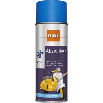 Das OBI Abziehlack Blau seidenmatt 400 ml ist ein hochwertiger, extrem elastischer Abziehlack auf synthetischer Kunstharzbasis für Innen und Außen. Für Schutz, für Deko und Design am Auto (z.B. Felge), Motorroller oder für zahlreiche andere Anwendungsbereiche aus dem bereich Freizeit, Sport und Deko, wie z.B. Skateboard, Fahrrad, Vasen, Pflanzküberl, Laptops, Werkzeuge usw.