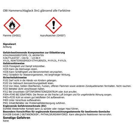 OBI Hammerschlaglack 3 in 1 ist ein lösemittelhaltiger, aromatenfreier, haftstarker Spezial Metallschutzlack auf Kunstharzbasis für dekorative und rostschützende Anstriche auf Metallen. Aktive Rostschutzpigmente versiegeln den Rost zuverlässig, während gleichzeitig hochwertige Harze eine witterungsbeständige, feuchtigkeitsschützende Deckschicht bilden. Somit ist OBI Metallschutzlack nicht nur Grundierung und Korrosionsschutz, sondern auch ein perfekter Decklack in effektvoller Hammerschlag-Optik. Auch für die Lackierung von vorbereiteten und grundierten Untergrünen aus NE-Metallen und tragfähigen Altanstrichen im Innen- und Außenbereich geeignet.