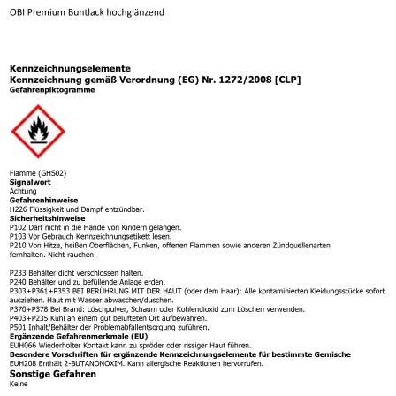 OBI Premium Buntlack ist ein lösemittelhaltiger, aromatenfreier High-Solid-Kunstharzlack mit ausgezeichneten Verarbeitungseigenschaften, sehr gutem Deckvermögen und hervorragendem Verlauf, blockfest, stoß-, kratz- und schlagfest, sehr gute Wetterbeständigkeit und Glanzhaltung, geruchsarm und sehr ergiebig. Für professionelle, hochwertige Decklackierungen auf allen vorbereiteten und grundierten Untergründen aus Holz, Metall und lackierbaren Kunststoffen sowie auf tragfähigen Altbeschichtungen im Innen- und Außenbereich.