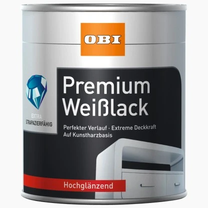 OBI Premium Weißlack ist ein lösemittelhaltiger, aromatenfreier Kunstharzlack mit ausgezeichneten Verarbeitungseigenschaften, blockfest, stoß-, kratz- und schlagfest, hervorragender Verlauf, hohes Deckvermögen, überdurchschnittliche Wetterbeständigkeit und Glanzhaltung, geruchsarm und sehr ergiebig.