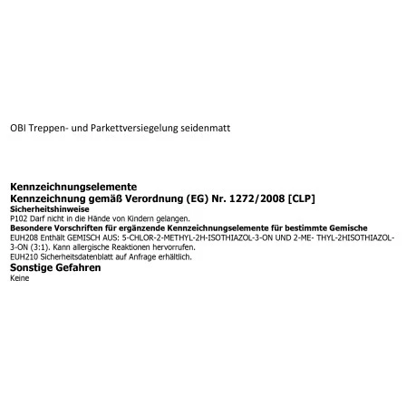 OBI Treppen- und Parkettversiegelung ist ein wasserverdünnbarer, besonders abriebfester Einkomponenten-Klarlack für Innenholzwerk wie z.B. normal beanspruchte Holz-, Kork- und Parkettfußböden, Türen, Möbel, Sockelleisten, Profilholz etc. OBI Treppen- und Parkettversiegelung ist PU-verstärkt, widerstandsfähig gegen zahlreiche Reinigungsmittel, blockfest, lichtbeständig, geruchsneutral, schnell trocknend und leicht zu verarbeiten.