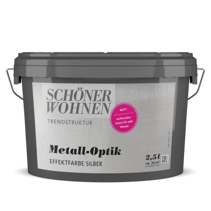 Die Schöner Wohnen Metall Optik Effektfarbe matt ist eine wasserverdünnbare, scheuerbeständige Effektfarbe für individuelle Gestaltung und Dekorationen in metallischem Look. Optimale Untergründe sind Raufaser, Vlies- und Glasgewebetapeten und gut erhaltene Dispersionsfarbenanstriche.