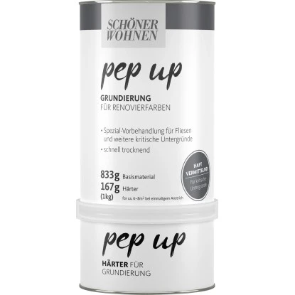 Die Schöner Wohnen pep up Grundierung für Renovierfarben ist 2-komponentig, wasserbasiert, besitzt ein hervorragendes Haftvermögen, ist schnell trocknend und kann auf Fliesen, sehr glatten Melaminharzplatten und anderen nicht bzw. schwach saugenden Untergründen als Vorbehandlung für Schöner Wohnen pep up Renovierfarben eingesetzt werden.